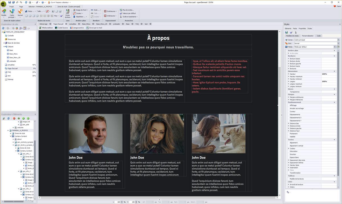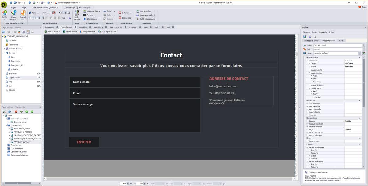 Comme vous pouvez le voir, le template SENSBLACK comporte de tous nouveaux éléments ainsi que du code spécialement développé et intégré au mieux dans Openelement.